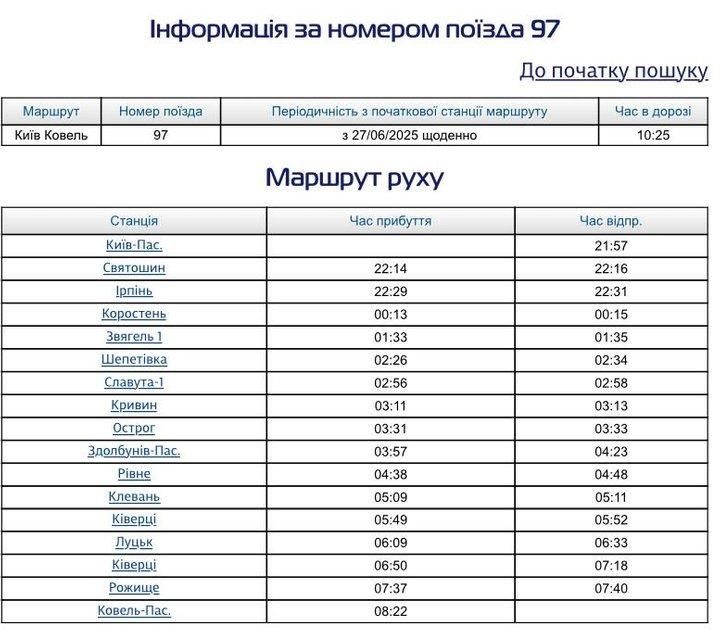 - № 98/97 Ковель — Київ (зупинки в Звягелі-1 та Коростені);