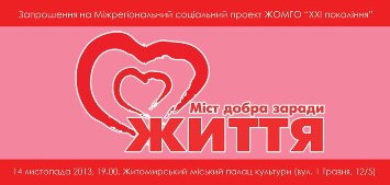 Громадська організація "ХХІ покоління" та її керівник Віталій Сівко організовують захід Листопад Благодійності – Міст добра заради життя», до якого приєдналися артист та фіналіст проекту "Голос країни" Артем Кондратюк, композитор та музикант Олександр Мінаєв та відомий український гурт "Полюси". Саме вони виступлять в Житомирі 14 листопада.