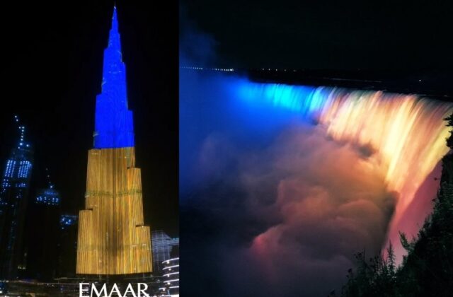 Найвищий у світі хмарочос Бурдж Халіфа (828 м) підсвітили кольорами українського прапора та увімкнули Гімн України з нагоди Дня Незалежності. Також синьо-жовтим був 24 серпня Ніагарський водоспад.
