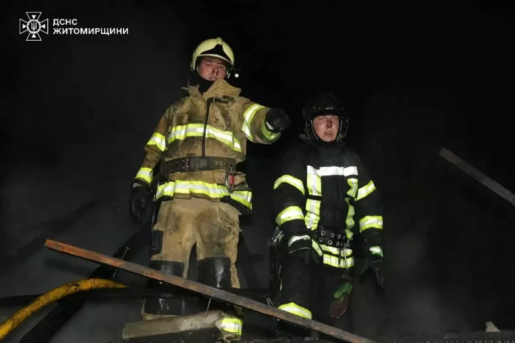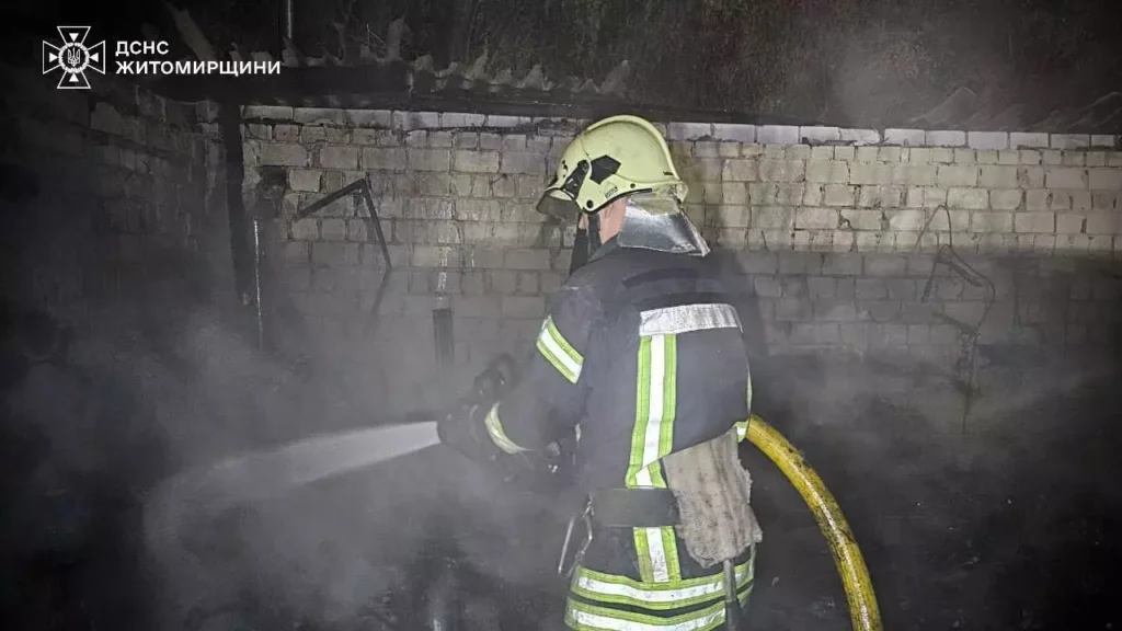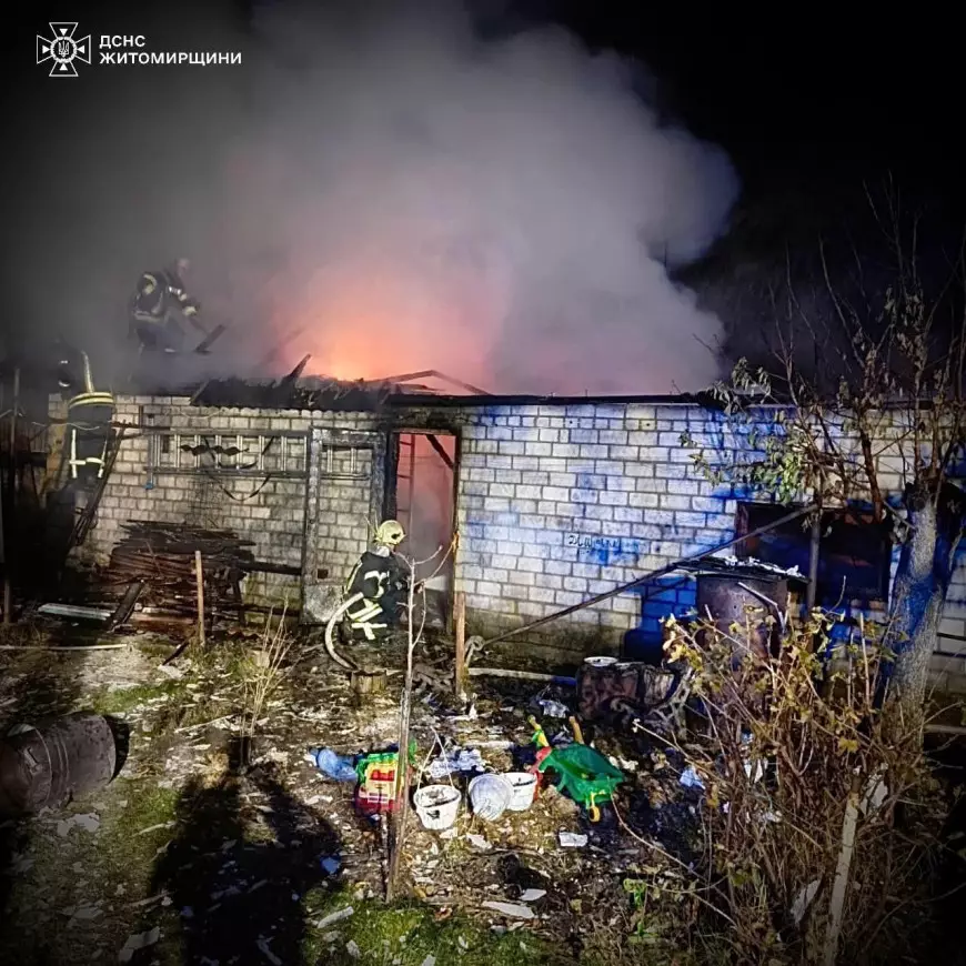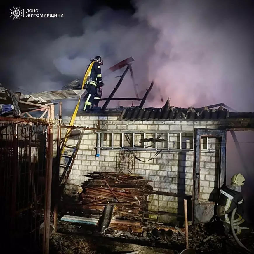 Як повідомили в ГУ ДСНС у Житомирській області, на момент прибуття рятувальників вогнем була охоплена покрівля споруди, домашнє майно та автомобіль, який знаходився всередині.