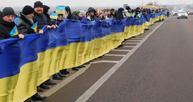 Кілька сотень жителів обох областей об’єдналися живим ланцюгом, чим символічно продемонстрували об’єднання України.