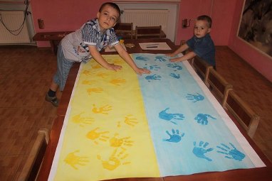 "Щоранку мами приводили дітей. Дуже пунктуальні мами, а діти в них виховані, не вередують, одразу видно, що родини військових, – посміхається Лілія Намесник. – Бувало таке, що діти просто не хотіли від нас йти, плакали. Значить їм тут сподобалося. Ми з ними зробили дуже хорошу справу – на паперовому ватмані з символікою прапора залишили відбитки долонь, а після цього все це перенесли на тканину із підписом кожного відбитка діток віком від 6 місяців до 14 років. Вони старалися для своїх батьків, а взамін отримували солодощі. У День Прапора – 23 серпня, ми плануємо що цей наш прапор поїде на передову, де ми його і передамо командиру 95 бригади. Кожен тато побачить відбитки своєї дитини, вони зігріватимуть його. Прапор вивісять на найвищому флагштоці, щоб усі захисники бачили його і знали, за кого стоять на Сході країни".