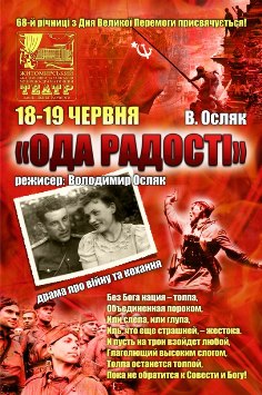 До 68-ї річниці з Дня Великої Перемоги 18 та 19 червня о 19.00 на сцені Житомирського академічного музично-драматичного театру покажуть виставу "ОДА РАДОСТІ" за мотивами твору Р. Ібрагімбекова "Прикосновение".