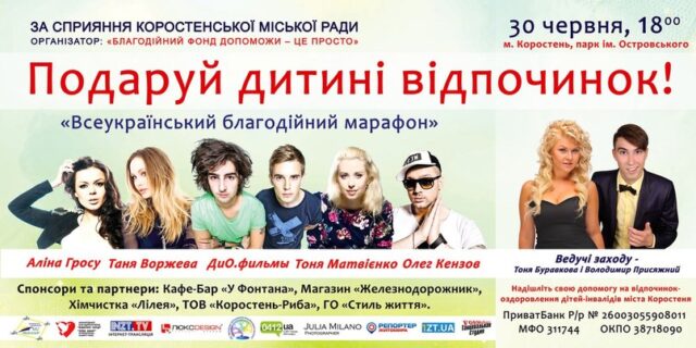 Житомирян запрошують 30 червня у Коростень в парк ім.Отровськго на концерт "Подаруй дитині відпочинок" в рамках Всеукраїнського благодійного марафонуза участю молодих зірок української естради.