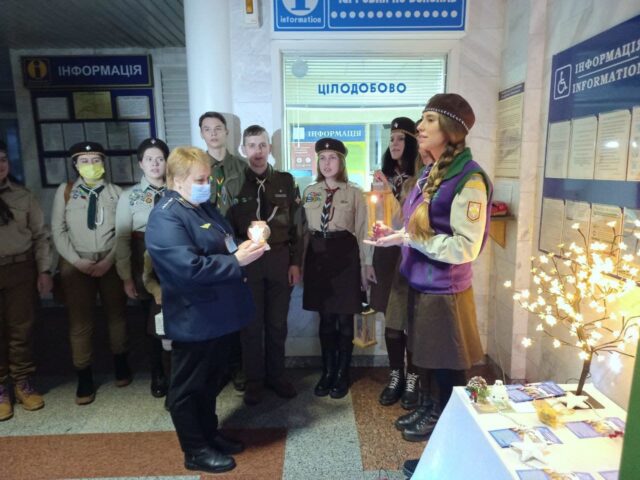 О 16:00 працівниця залізниці передала вогонь пластунам – скаутській організації. Далі його передадуть у храми, лікарні, військовим, а вже 19 грудня принесуть на відкриття новорічної ялинки.