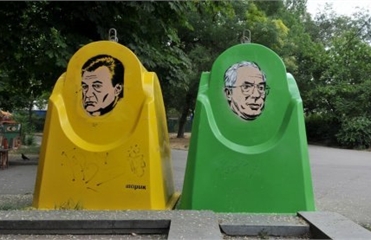 Напротив Верховного Совета Крыма появились граффити с изображением президента Виктора Януковича и премьер-министра Николая Азарова на мусорных контейнерах