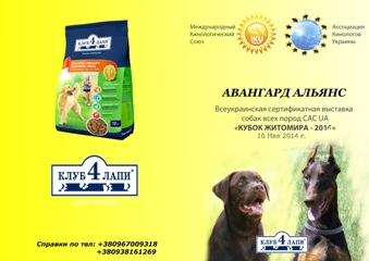 Кінологічний клуб «АВАНГАРД АЛЬЯНС» та Асоціація Кінологів України запрошує всіх власників породистих собак взяти участь у виставці рангу САС "Кубок Житомира-2014" .