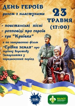 Житомирян відзначити День героїв місцеві пластуни запрошують 23 травня о 17.00 до "Брами" на Михайлівській та обіцяють цікаву програму святкування: пісні, ігри, розповіді про герої, перегляд фільму.