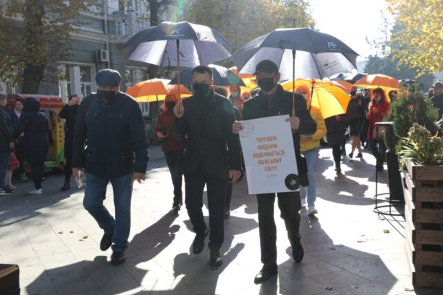 У Житомирі 16 жовтня на Михайлівській провели акцію проти торгівлі людьми. Близько 50 жителів міста ходили по вулиці із чорними та помаранчевими парасольками, аби привернути увагу до торгівлі людьми.
