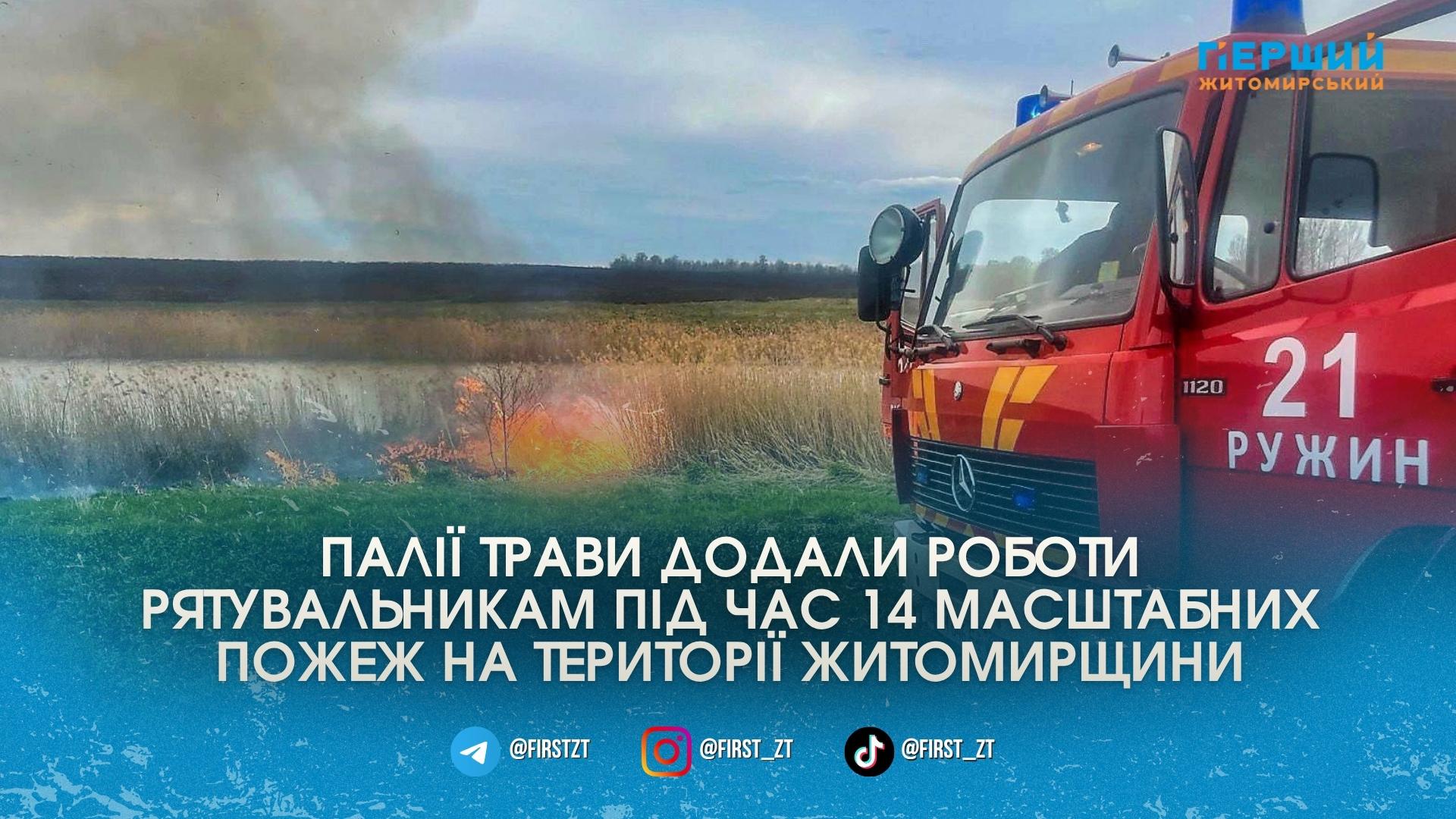 Лише за минулу добу на Житомирщині сталося 14 пожеж в екосистемах, через які вигоріло понад 11 гектарів території. Рятувальникам довелося масово виїжджати на гасіння сухої трави, щоб зупинити поширення полум’я на ліси.