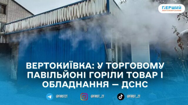 23 лютого вдень у селі Вертокиївка Житомирського району сталася пожежа в торговому павільйоні — горіли товар та обладнання. На момент загоряння павільйон не працював, повідомили в ГУ ДСНС у Житомирській області.