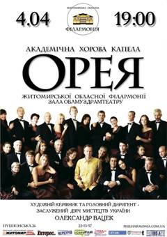 4 квітня, о 19:00, у залі Облмуздрамтеатру, відбудеться концерт Житомирської академичної хорової капели «Орея» (Художній керівник та головний диригент – заслужений діяч мистецтв України Олександр Вацек.)