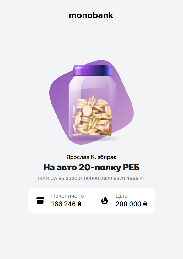 Посилання на банку: https://send.monobank.ua/jar/6FAUzgtxs9