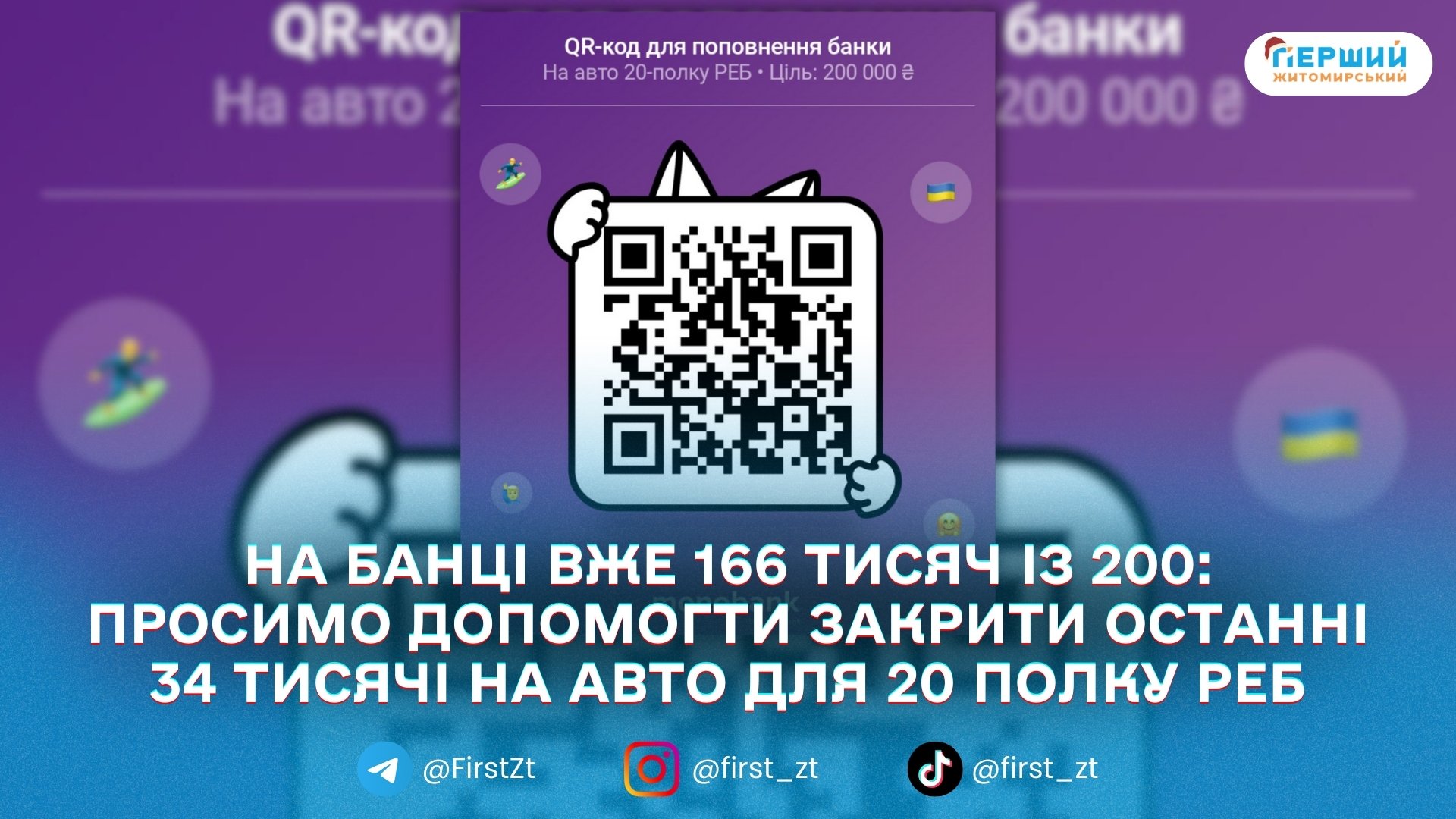 Друзі, після другої доби повітряних атак по Житомирщині та напередодні Різдва й Нового року Перший Житомирський вирішив, що не зайвим буде нагадати вам про збір, які ми підтримали ще на початку листопада та попросити вас допомогти закрити «банку» на авто для 20 окремого полку радіоелектронної боротьби.
