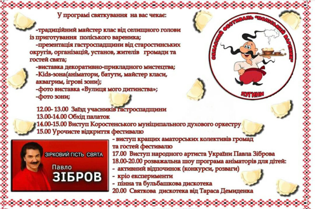 Якщо в Житомирі не сидиться, тоді ловіть дві круті події в області! Зібров, вареники, Лугини… Ні слова більше – виїжджаю! 18 вересня у Лугинах відбудеться фестиваль «Поліський вареник».