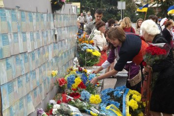 Після цього квіти поклали і до стенду з інформацією про загиблих героїв "Небесної сотні" перед Житомирською ОДА.