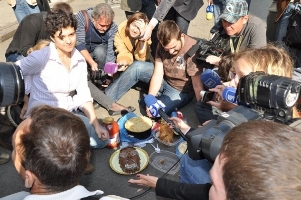 На знак протесту проти перебування Дмитра Табачника на посаді міністра освіти, мистецьке об’єднання "Братство святого Луки" провело у Києві акцію із поглинання шкідливої їжі.