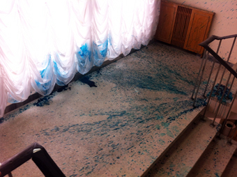 Зеленкою облили колишнього керівника області Сергія Рижука, який під час перерви вийшов у коридор 4 поверху.