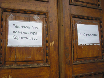 У Коростишеві відкрито Штаб революції. Саме написано на дверях у приміщенні Коростишівської державної адміністрації, де чатують Голову – Котенко Надію Миколаївну. Її розшукують по всьому місту з 19 лютого, коли активісти вимагали у керівників вийти з Партії регіонів, а Котенко з того часу не виходить до місцевої громади.