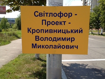 Біля світлофору красується напис: «Світлофор-проект – Кропивницький Володимир Миколайович». Також над написом висить інструкція, як користуватись кнопкою на світлофорі.