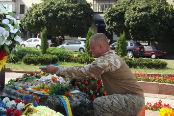 Перед поїздкою в зону АТО десантники 95 бригади згадали своїх загиблих товаришів. Вони поклали вінок до постамента на Соборному майдані, де розміщений плакат з інформаціюю про військовослужбовців Житомирщини, які загинули на Сході протягом останніх місяців.