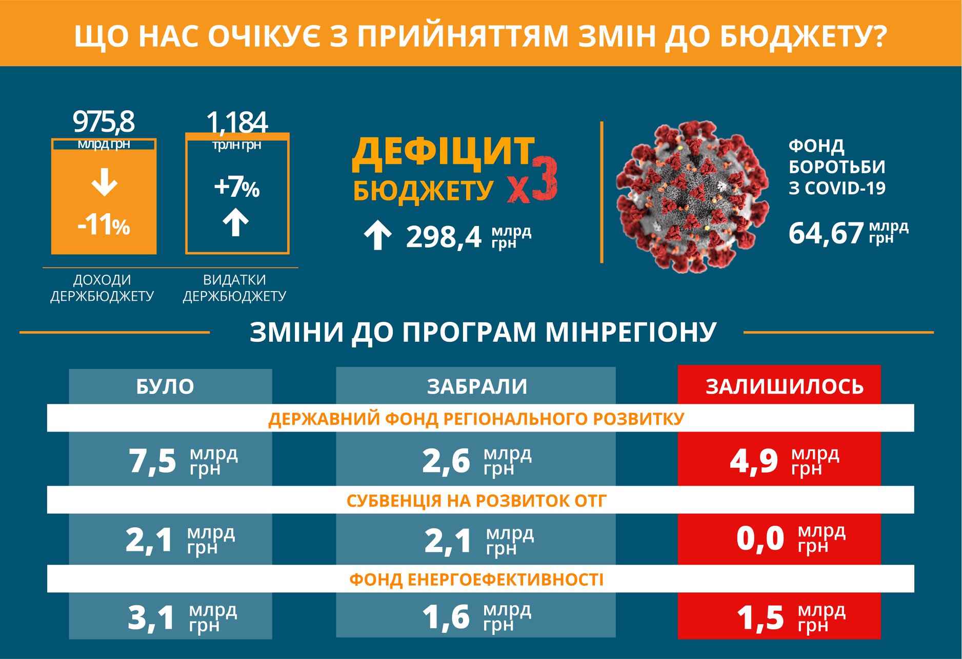 Нагадаємо, з міністерства розвитку громад і території "зняли" 6,8 млрд грн на боротьбу з коронавірусом. Бюджет Фонду боротьби з коронавірусом становитиме 64,7 млрд грн.