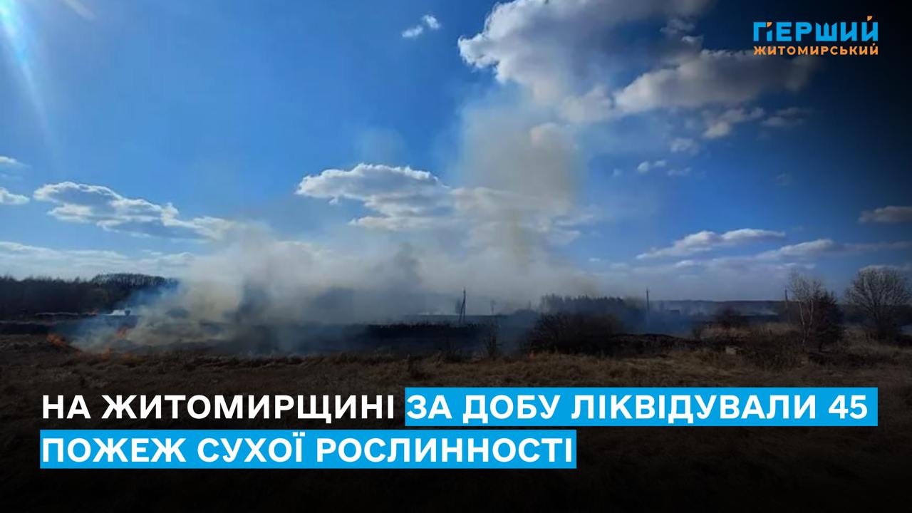 За минулу добу рятувальники Житомирської області ліквідували 45 загорянь сухої рослинності та чагарників. Вогонь охопив майже 48 гектарів території. Найбільше таких випадків зафіксовано в Житомирському та Коростенському районах.