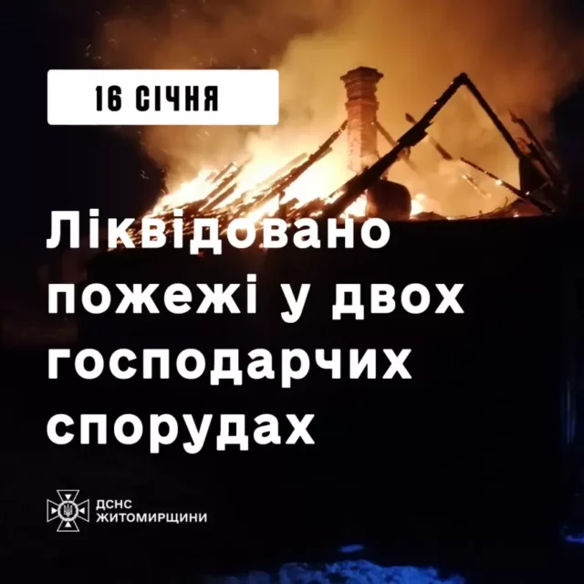 16 січня о 01:30 у селі Тетерівка Житомирського району спалахнула пожежа у господарчій будівлі. Горіла покрівля споруди на площі 50 кв. м, де розміщувалися гараж, літня кухня та лазня. Існувала загроза перекидання вогню на житловий будинок поруч.