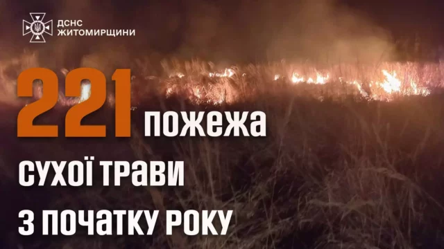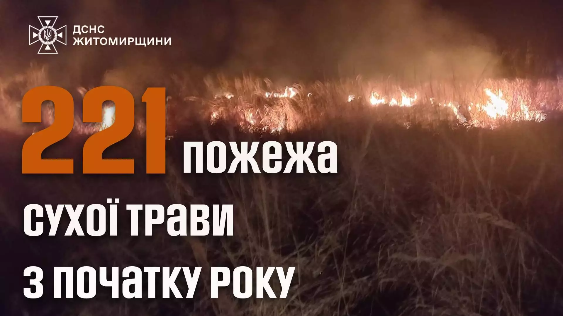 З 2 січня рятувальники ліквідували вже 221 пожежу сухої трави. Лише за останню добу сталося 27 загорянь, найбільше – у Житомирському, Коростенському та Бердичівському районах. Вогонь охопив понад 30 гектарів територій, створюючи загрозу житловим будинкам, лісам та сільськогосподарським угіддям, повідомляє ГУ ДСНС у Житомирській області.