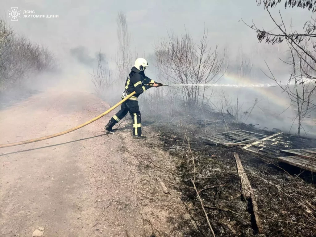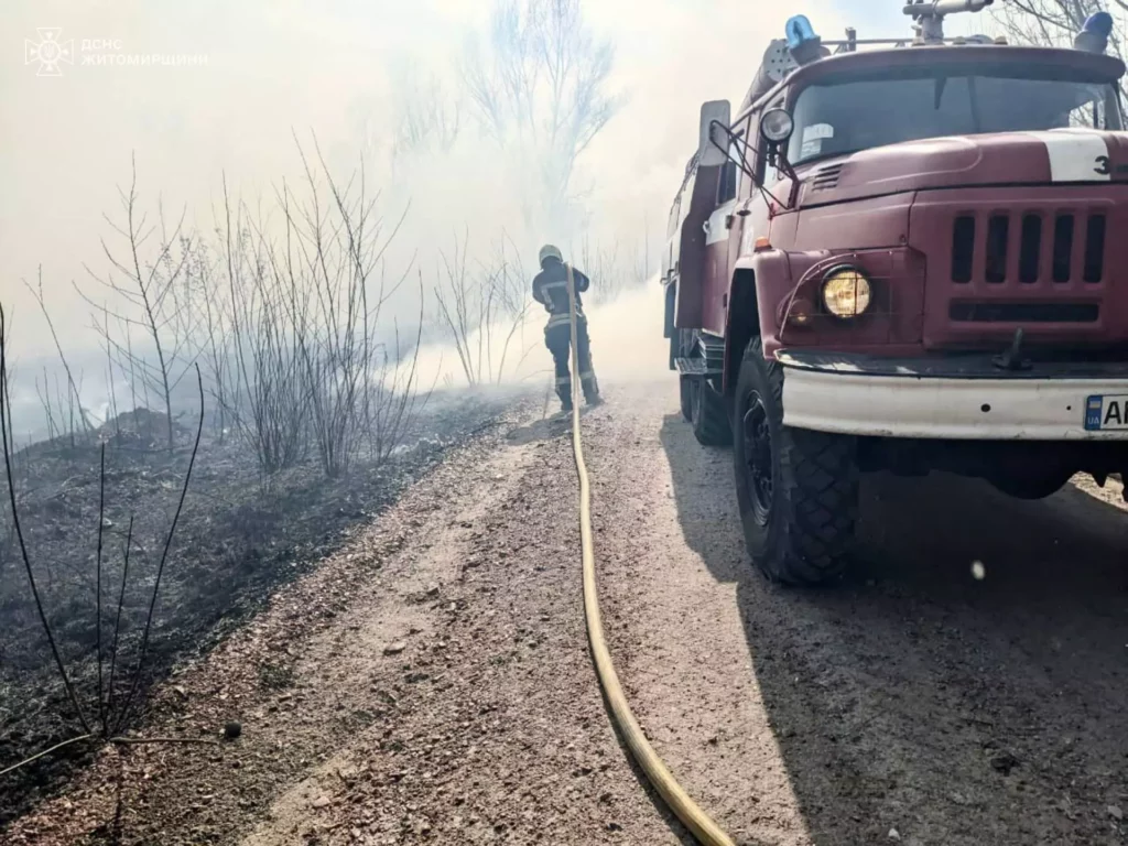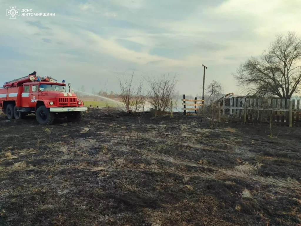 У селі Зарічани Житомирського району вогонь охопив 1 га сухостою. Через сильний вітер полум’я швидко поширювалося. 96-річний місцевий житель отримав опіки спини, намагаючись самостійно загасити пожежу. Ще один випадок травмування зафіксували в Коростенському районі.
