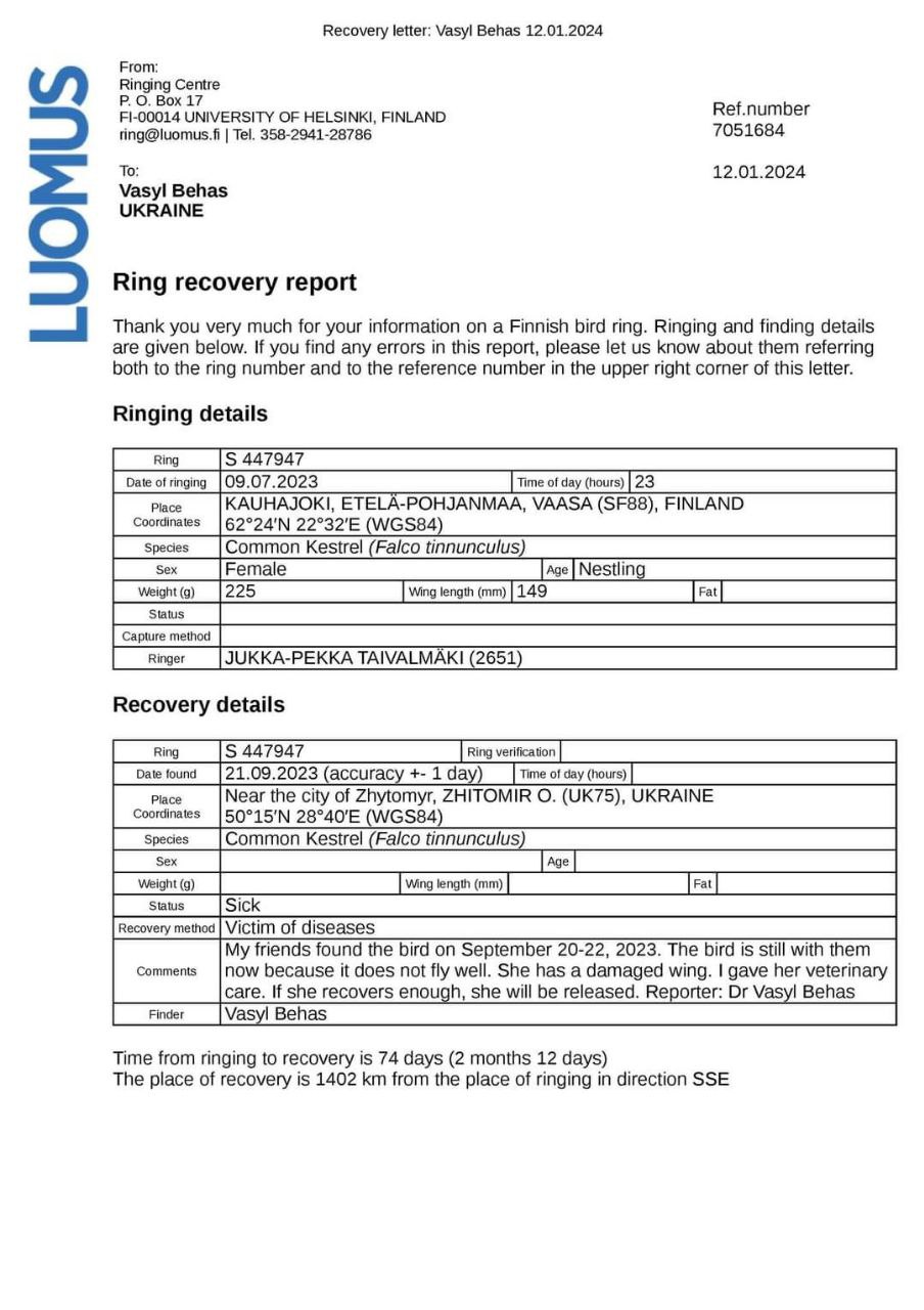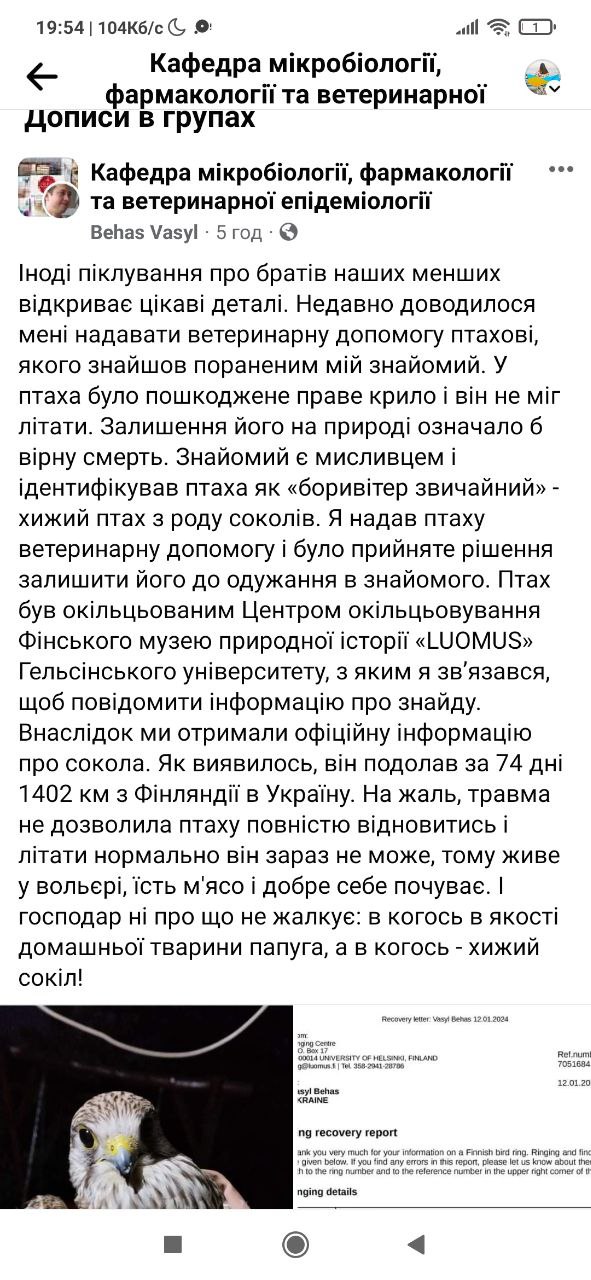 “Іноді піклування про братів наших менших відкриває цікаві деталі. Недавно доводилося мені надавати ветеринарну допомогу птахові, якого знайшов пораненим мій знайомий. У птаха було пошкоджене праве крило і він не міг літати. Залишення його на природі означало б вірну смерть. Знайомий є мисливцем і ідентифікував птаха як «боривітер звичайний» – хижий птах з роду соколів. Я надав птаху ветеринарну допомогу і було прийняте рішення залишити його до одужання в знайомого. Птах був окільцьованим Центром окільцьовування Фінського музею природної історії «LUOMUS» Гельсінського університету, з яким я зв’язався, щоб повідомити інформацію про знайду. Внаслідок ми отримали офіційну інформацію про сокола. Як виявилось, він подолав за 74 дні 1402 км з Фінляндії в Україну. На жаль, травма не дозволила птаху повністю відновитись і літати нормально він зараз не може, тому живе у вольєрі, їсть м’ясо і добре себе почуває. І господар ні про що не жалкує: в когось в якості домашньої тварини папуга, а в когось – хижий сокіл!”, – пише Василь.