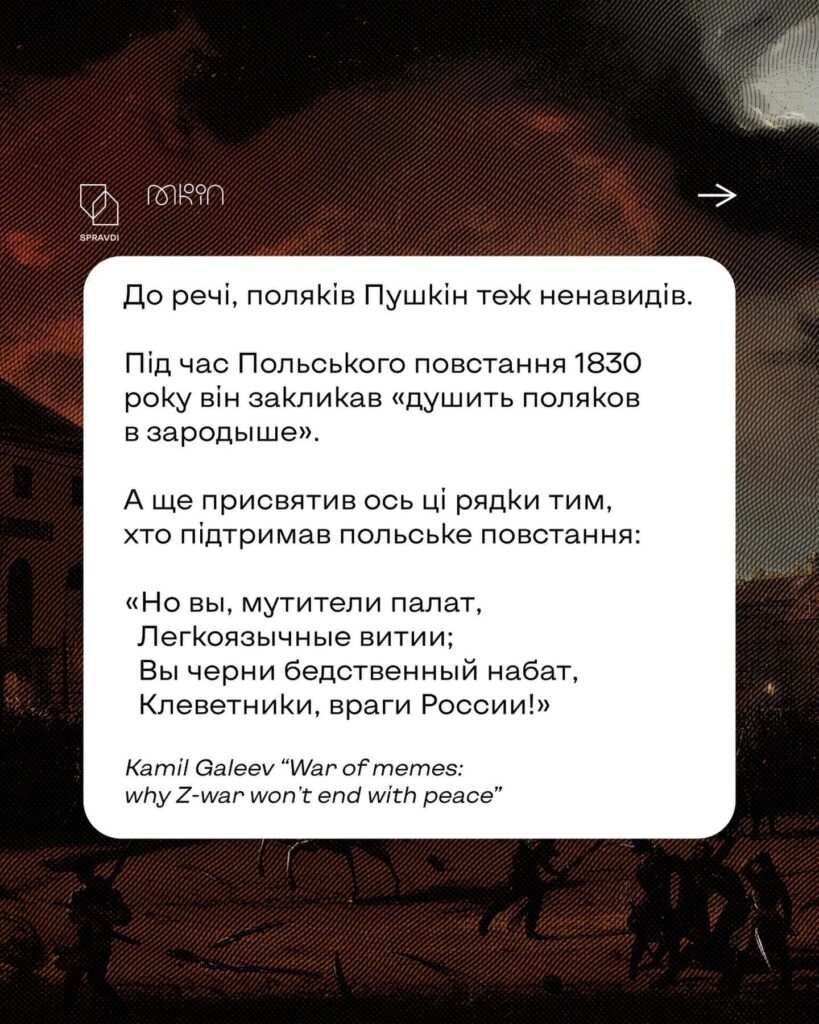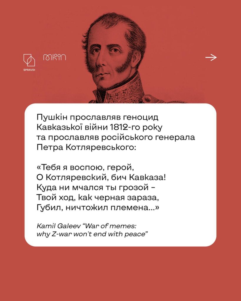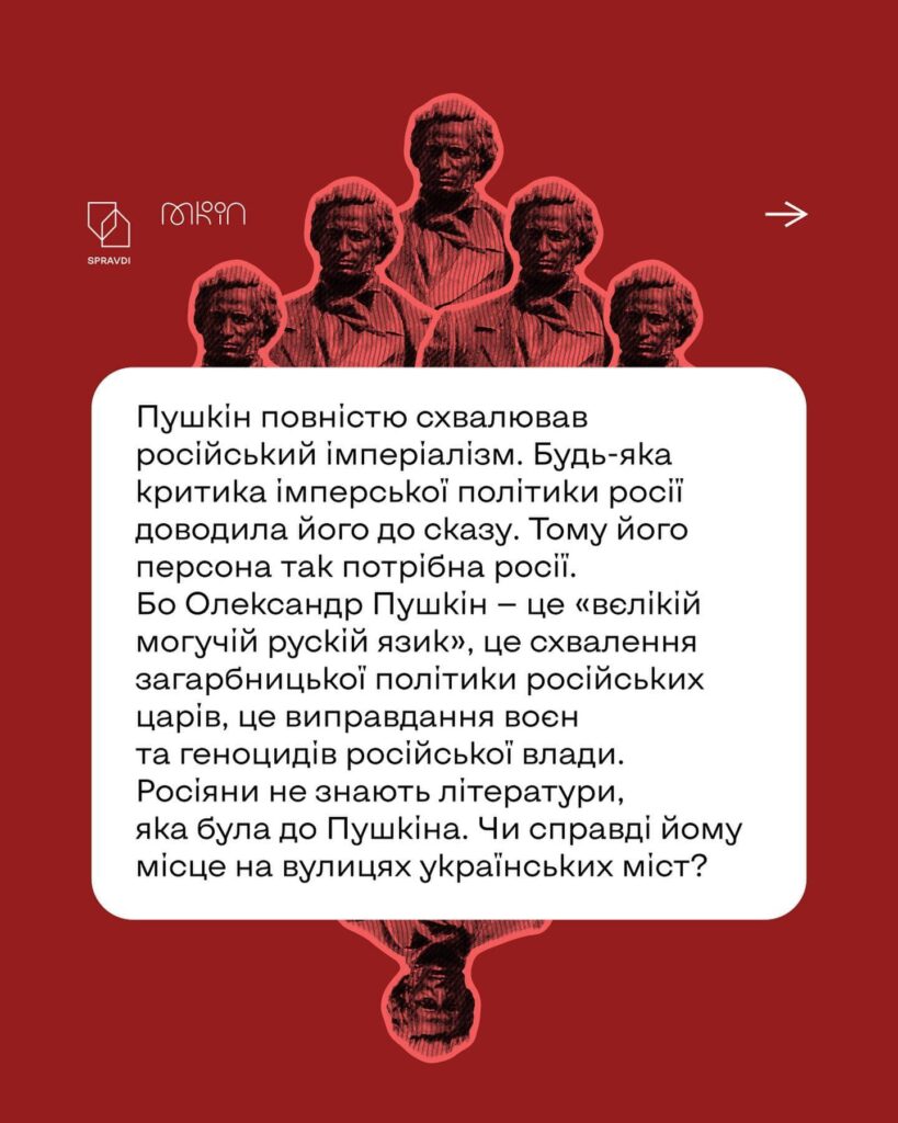 “Олександр Пушкін – це “вєлікій могучій рускій язик”, це схвалення загарбницької політики російських царів, це виправдання війн та геноцидів російської влади.