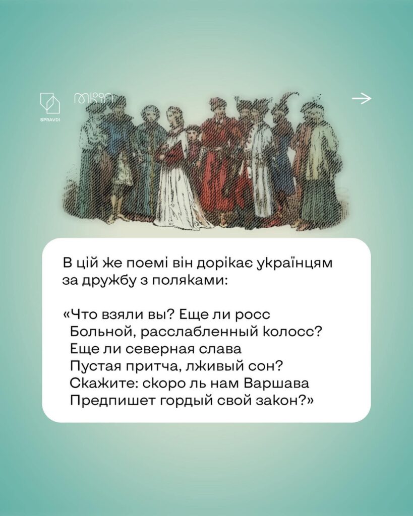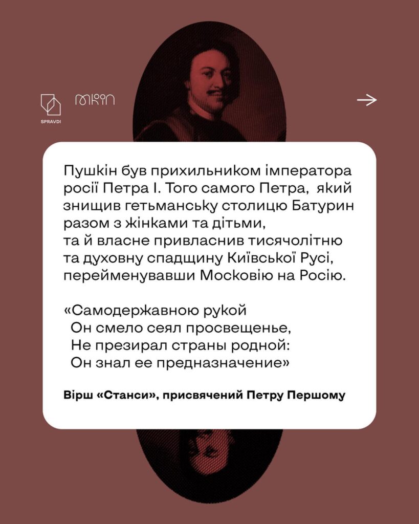 - Пушкін був прихильником Петра І, який знищив гетьманську столицю Батурин разом з жінками та дітьми та привласнив тисячолітню та духовну спадщину Київської Русі, перейменувавши Московію на Росію. Він презирливо ставився до гетьмана Івана Мазепи, зображаючи його наступним чином: