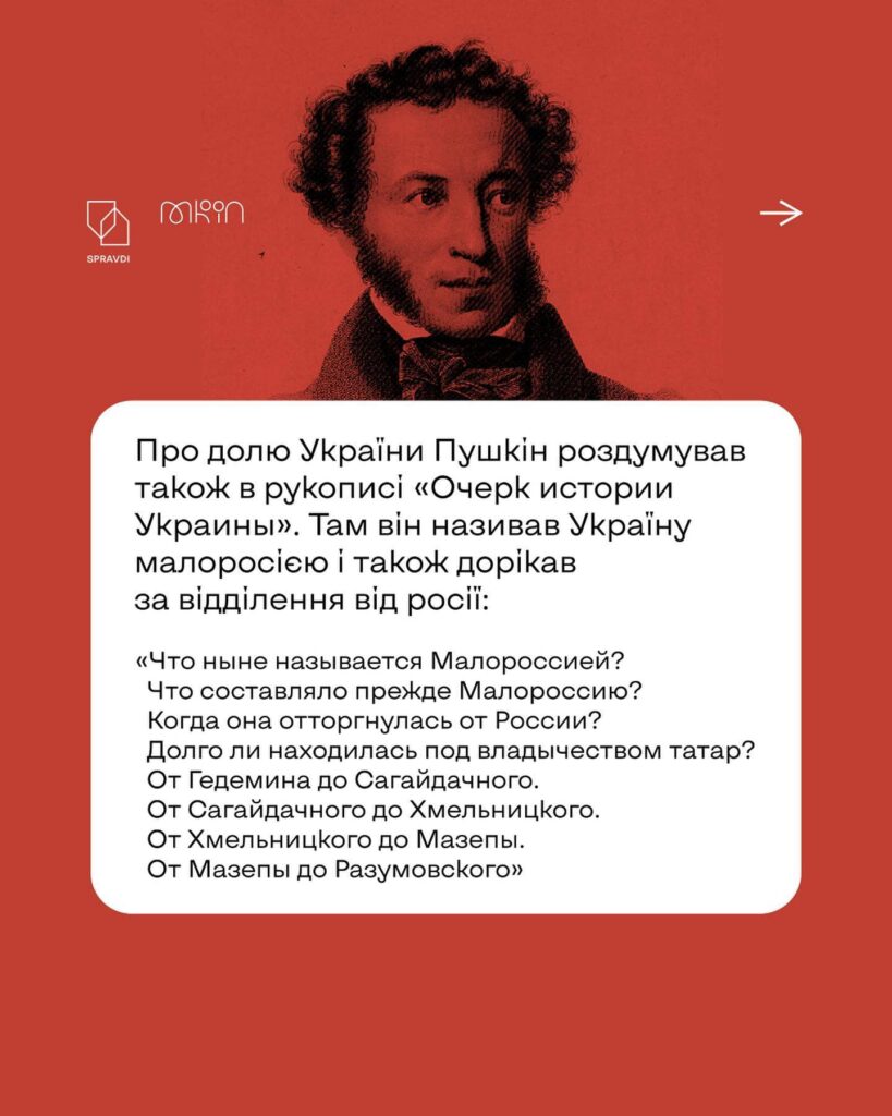 Пушкін також недвозначно висловлювався про долю України в рукописі “Очерки истории Украины”. Там він називав Україну “малоросією” і дорікав за прагнення незалежності: