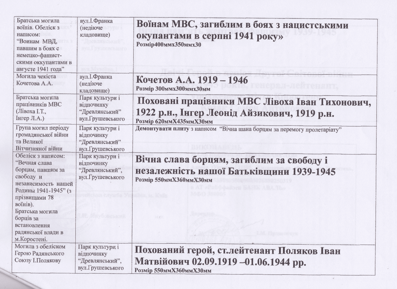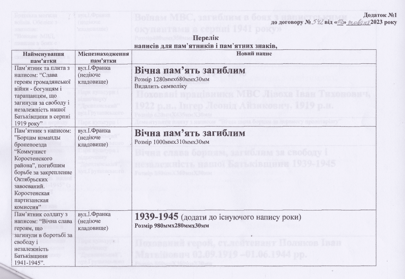 Останнє має до 31 грудня за 58 тис. грн змінити надписи на памятних знаком згідно з переліком нижче.