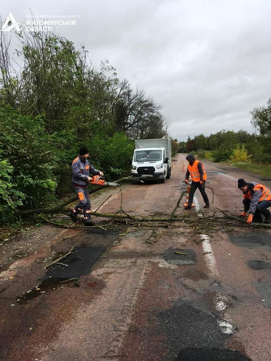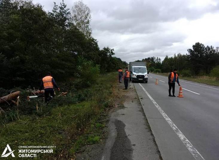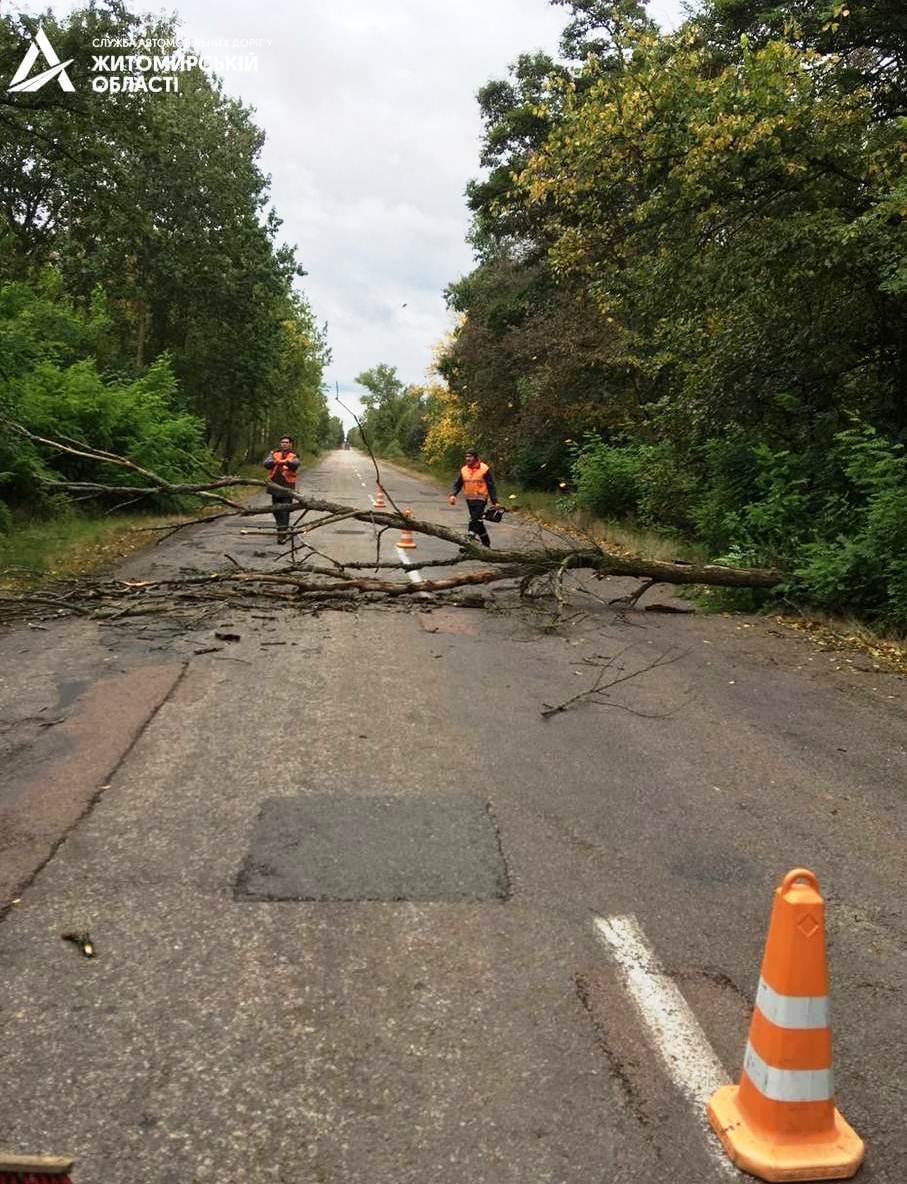 Шквальний вітер на Житомирщині поламав дерева. Частина з них бцли повалені на трасу та заважали руху авто.