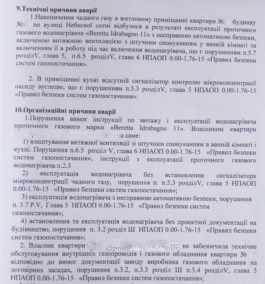 Смертельна концентрація СО утворилася у приміщені через одночасну роботу газового водонагрівача з несправною автоматикою безпеки та витяжною вентиляцією з штучним спонуканням у ванній кімнаті, що є порушенням п.5.7 розділу V, глави 5, п.6.5, розділу V, глави 6 «Правил безпеки систем газопостачання».