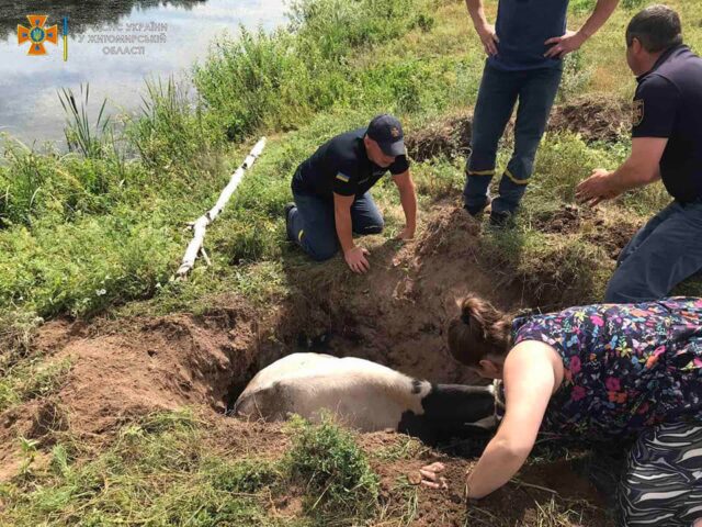 7 липня у Житомирському районі рятувальники витягали корову, яка впала в торфову яму. Вона лежала в ямі близько 4 годин, аж поки не приїхали рятувальники та не розкопали її. Тварина не травмувалася.