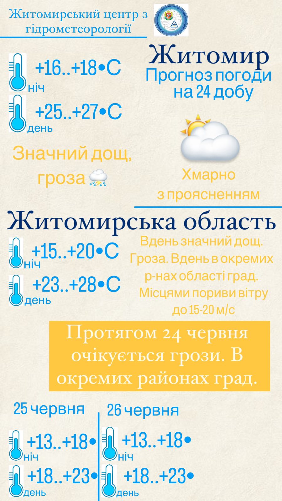 24 червня: Хмарно з проясненням. Вночі невеликий дощ. Вдень значний дощ. Гроза. Температура вночі +16-+18°C, вдень +25-+27°C.