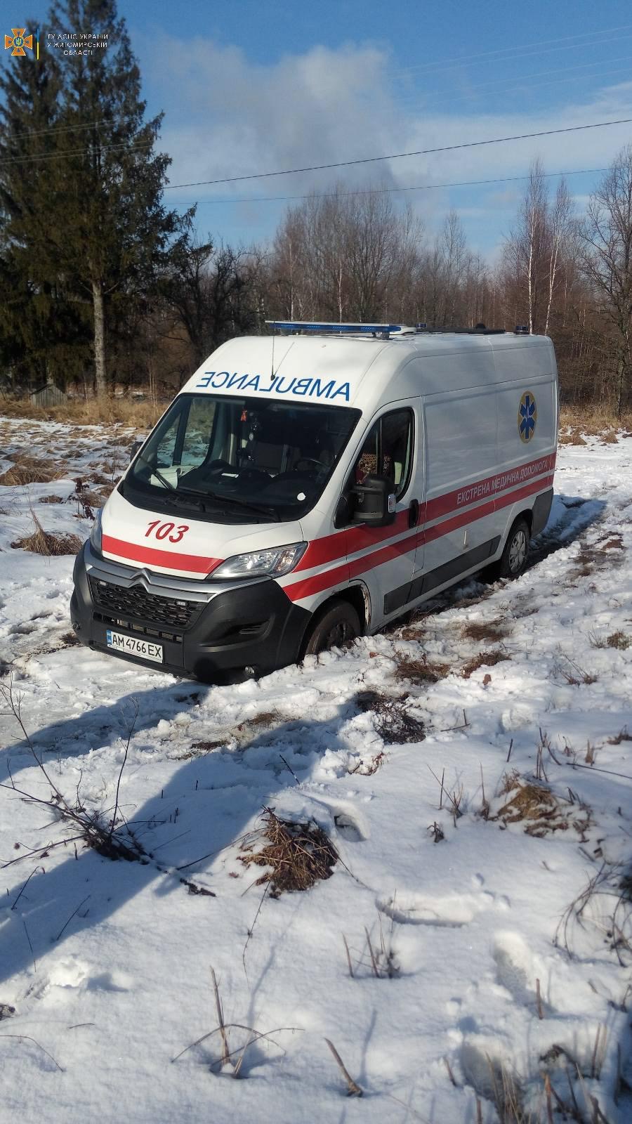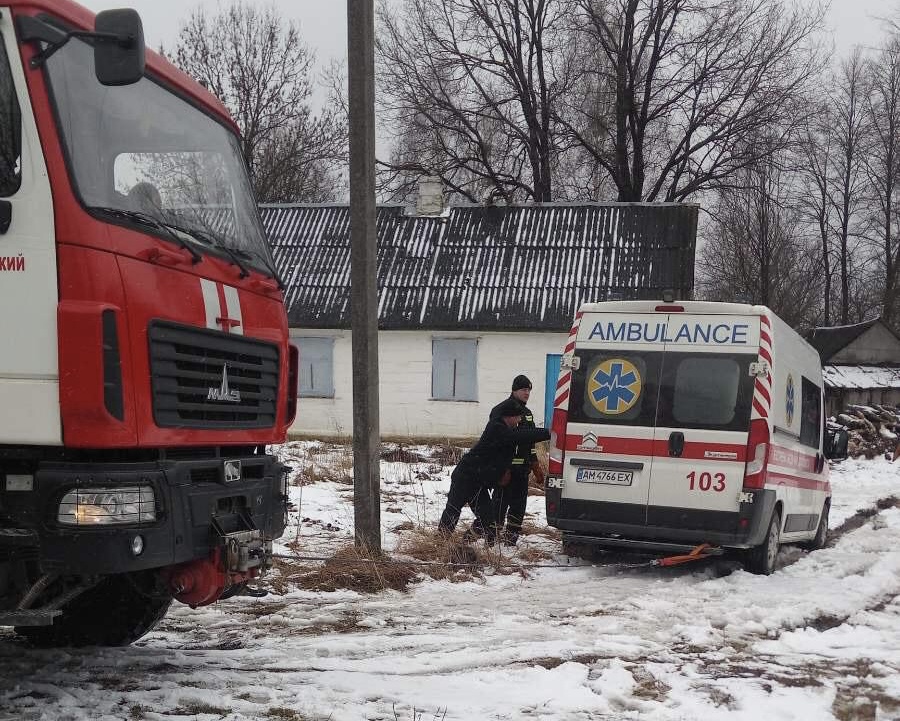 12 лютого до автомобіля швидкої в с. Федорівка Новоград-Волинського району викликали рятувальників, щоб відбуксирувати автомобіль, що на бездоріжжі застряг у снігу.
