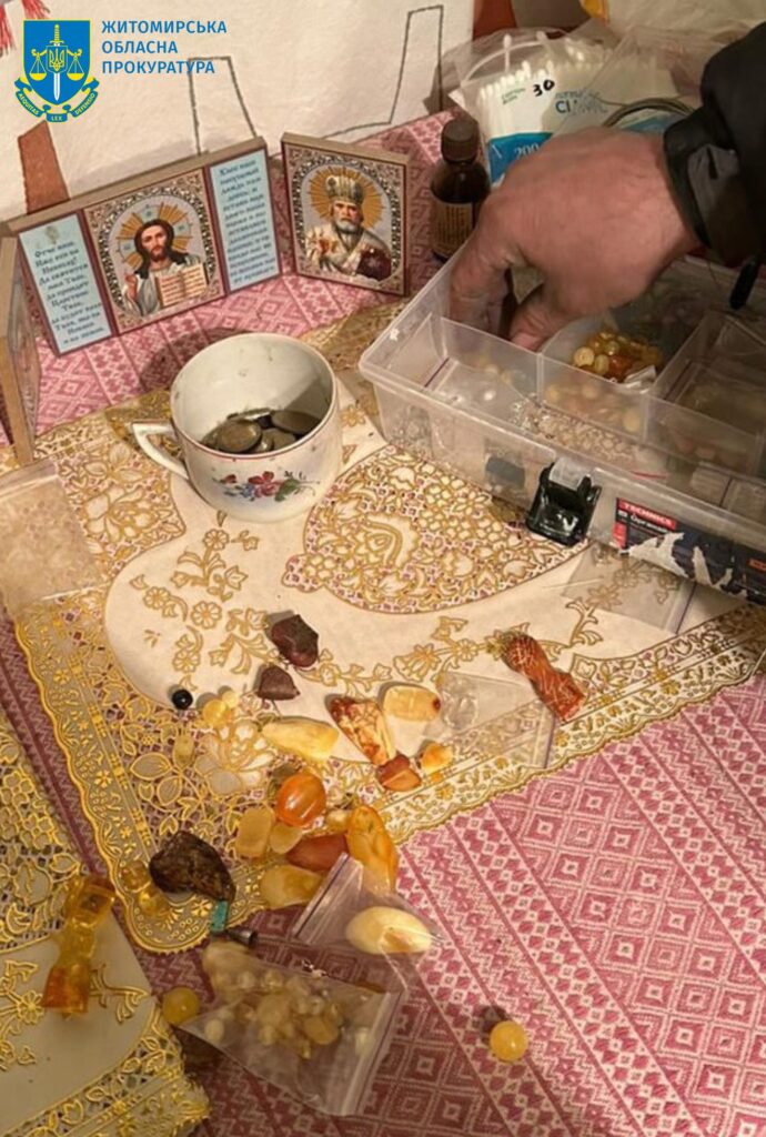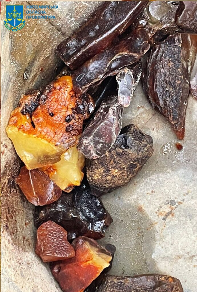 На місці видобування вилучили бурштин, водяну помпу, водозабірний шланг, чотири пожежних рукави, допоміжний інвентар. Крім цього, під час обшуків за місцем проживання фігурантів також було вилучено понад 1,5 кг обробленого бурштину і каменю-сирцю.