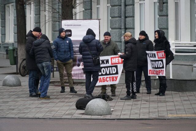 Близько десятка осіб тримали в руках плакати із надписами російською: “Скажи нет Covid рабству”, “Скажи нет Covid паспортам”.