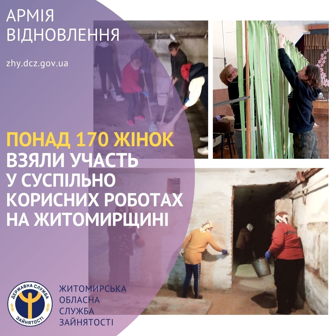 У Житомирській області до “Армії відновлення” долучилося 312 безробітних. Загалом цьогоріч у 25 територіальних громадах області до таких робіт, з яких 171 жінка.