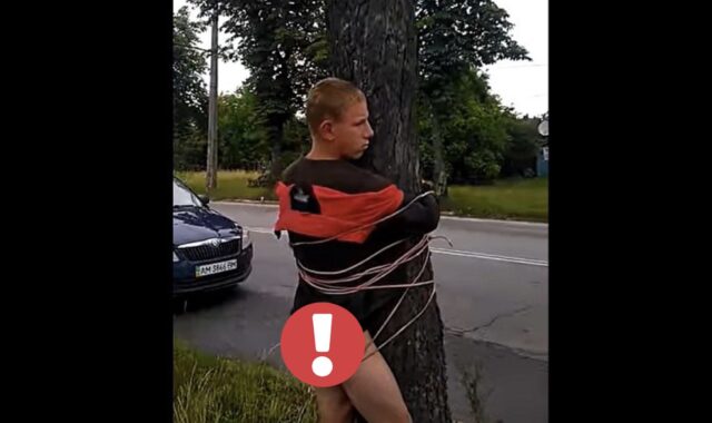 У Житомирі вранці 19 липня спіймали мародера. Молодик намагався пограбувати будинки сусідів. Житомиряни вирішили покарати його самотужки – прив’язали до найближчого до дороги дерева та спустили штани.