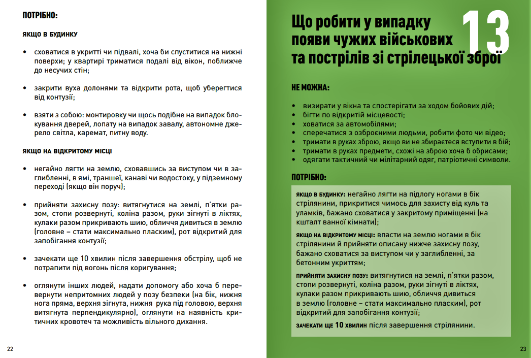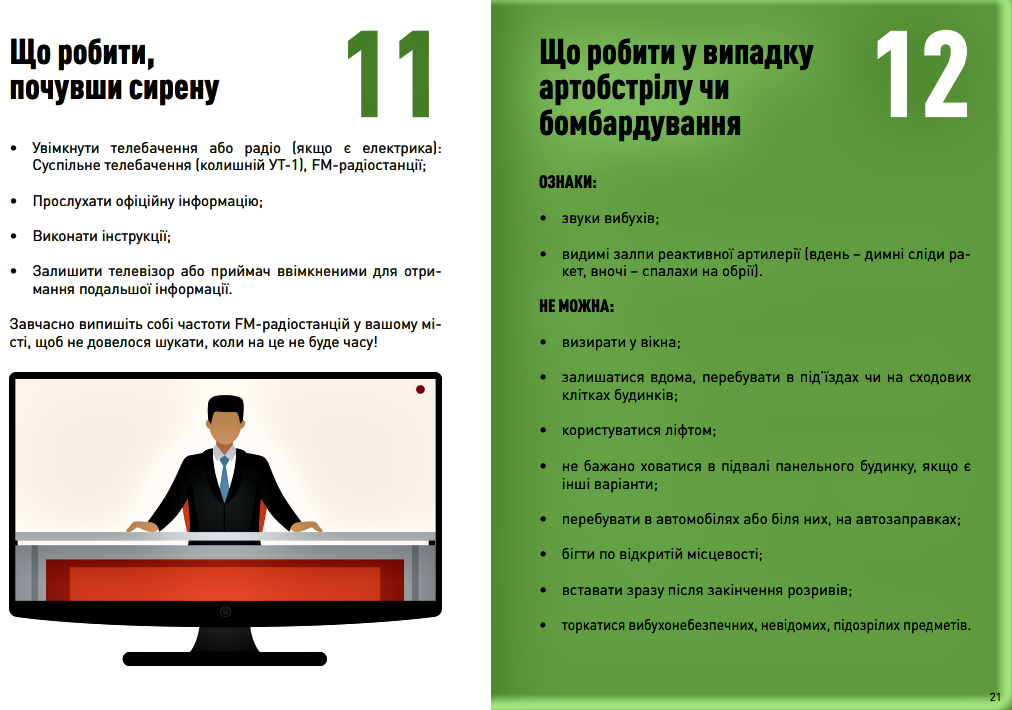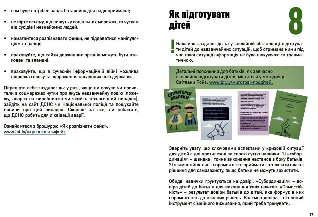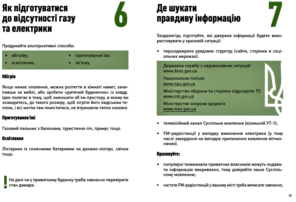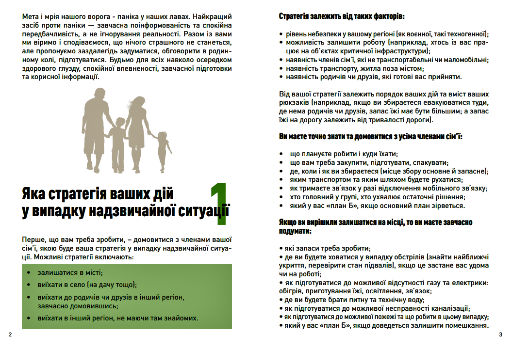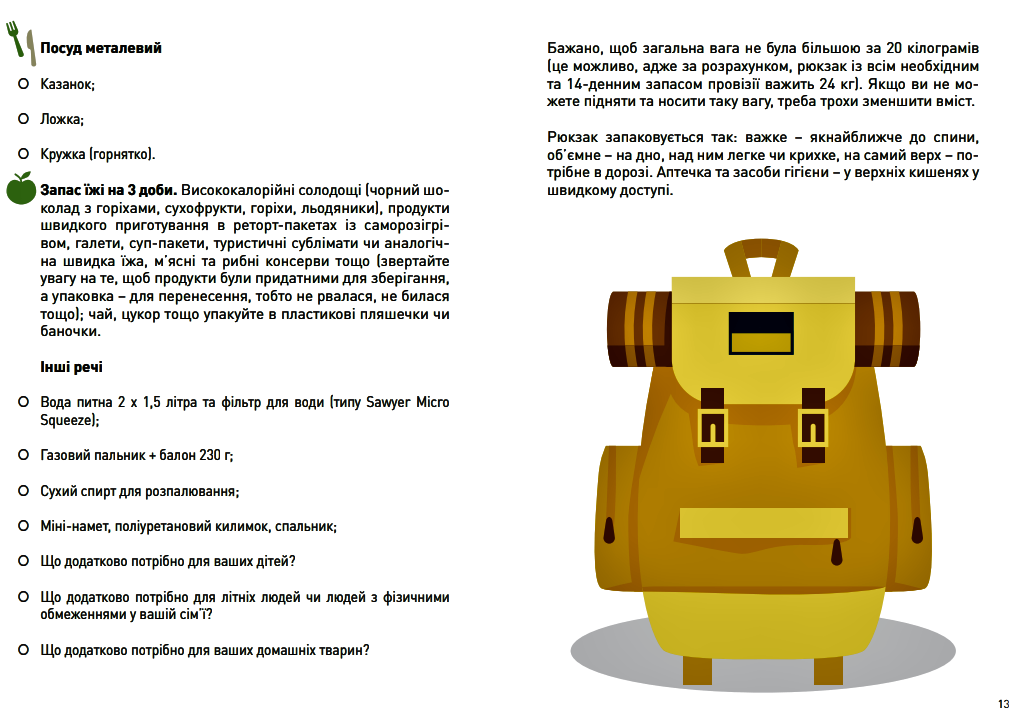 Українська волонтерська група підготувала пам’ятку «Ми готові» про те, як діяти у кризових ситуаціях (воєнного чи техногенного характеру). Які речі першочергово слід підготувати у разі нападу та що покласти в рюкзак безпеки? Куди тікати під час стрілянини?
