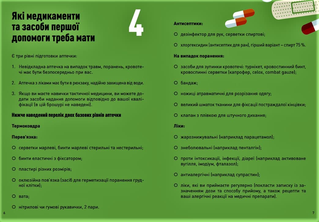 Аптечка має містити ліки на випадок травм, поранень, кровотеч, вата, бинти, пластирі, перев’язка, нітрилові чи гумові рукавички, антисептики, ліки від температури, знеболюючі тощо.