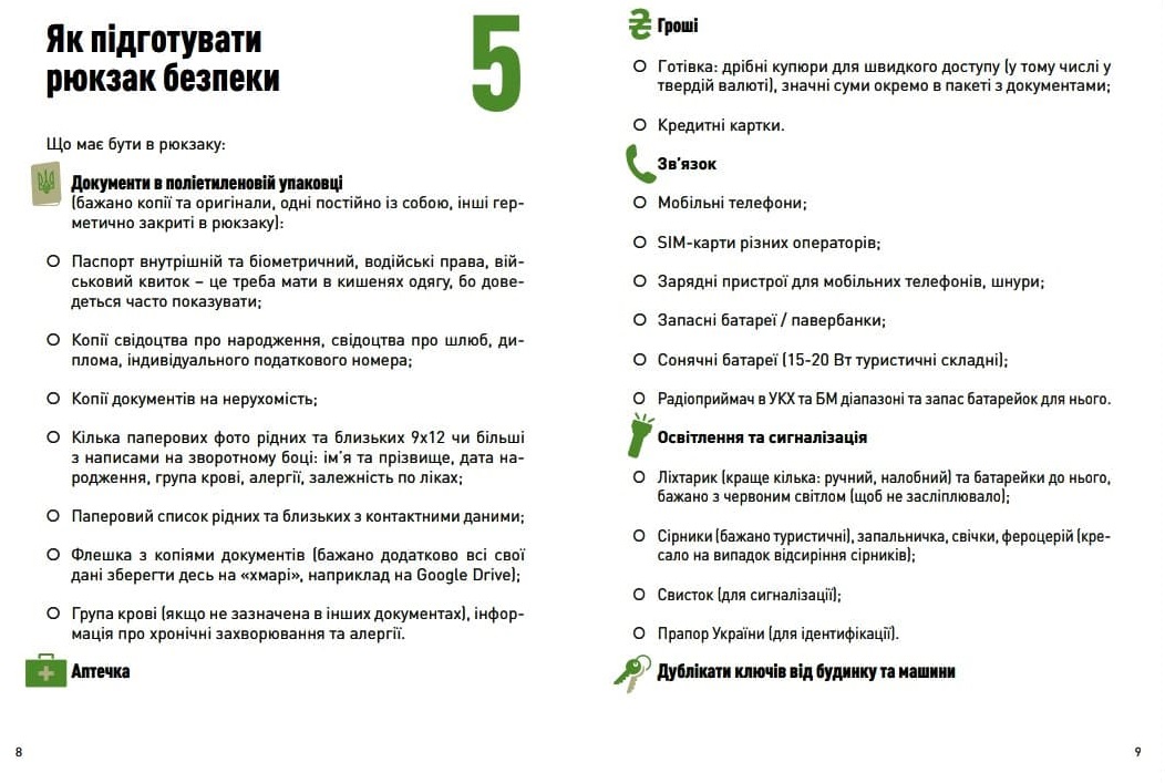 «В поліетиленовій упаковці зберігайте всі важливі документи: паспорт, код, водійський та військовий квиток, копії документів про нерухомість, кілька паперових фото рідних та близьких 9 на 12, паперовий список рідних та близьких з контактними даними, флешка з копіями документів, група крові (інформація про хронічні захворювання)», – зазначають автори.