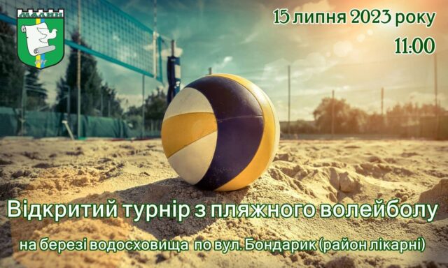 “Запрошуємо жителів та гостей Малинської громади на Відкритий турнір з пляжного волейболу, який проходитиме 15 липня на березі водосховища по вул. Бондарик (район лікарні)“.