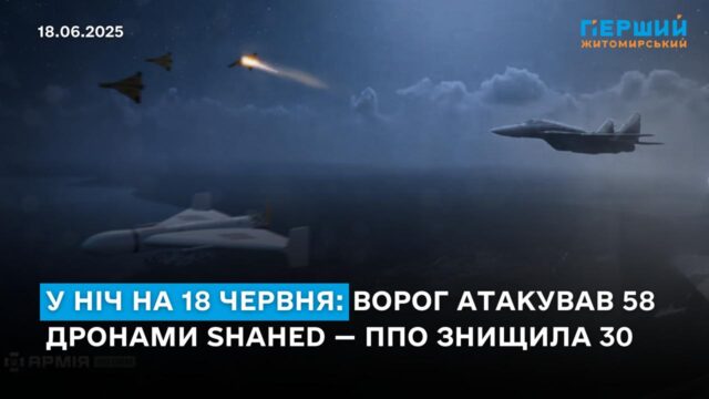 У ніч на 18 червня, починаючи з 23:00 17 червня, Росія здійснила чергову повітряну атаку по території України. Загалом було зафіксовано запуск 58 ударних безпілотників типу Shahed та імітаторів БпЛА різних типів з напрямків Курськ, Приморсько-Ахтарськ (РФ), а також з території тимчасово окупованого Криму (Чауда).