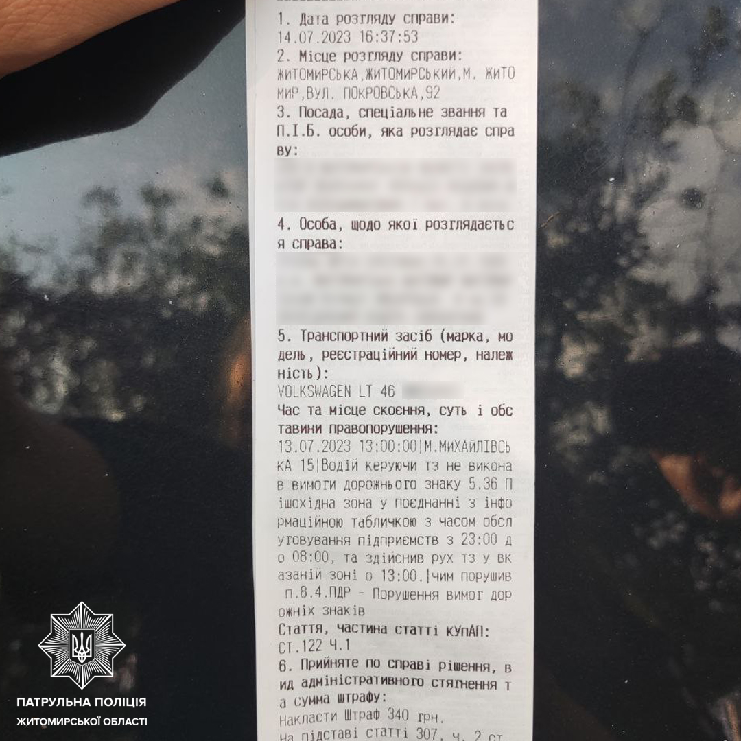 Штраф у 340 грн виписали патрульні водію Volkswagen, який проїхав по пішохідній Михайлівській у Житомирі.